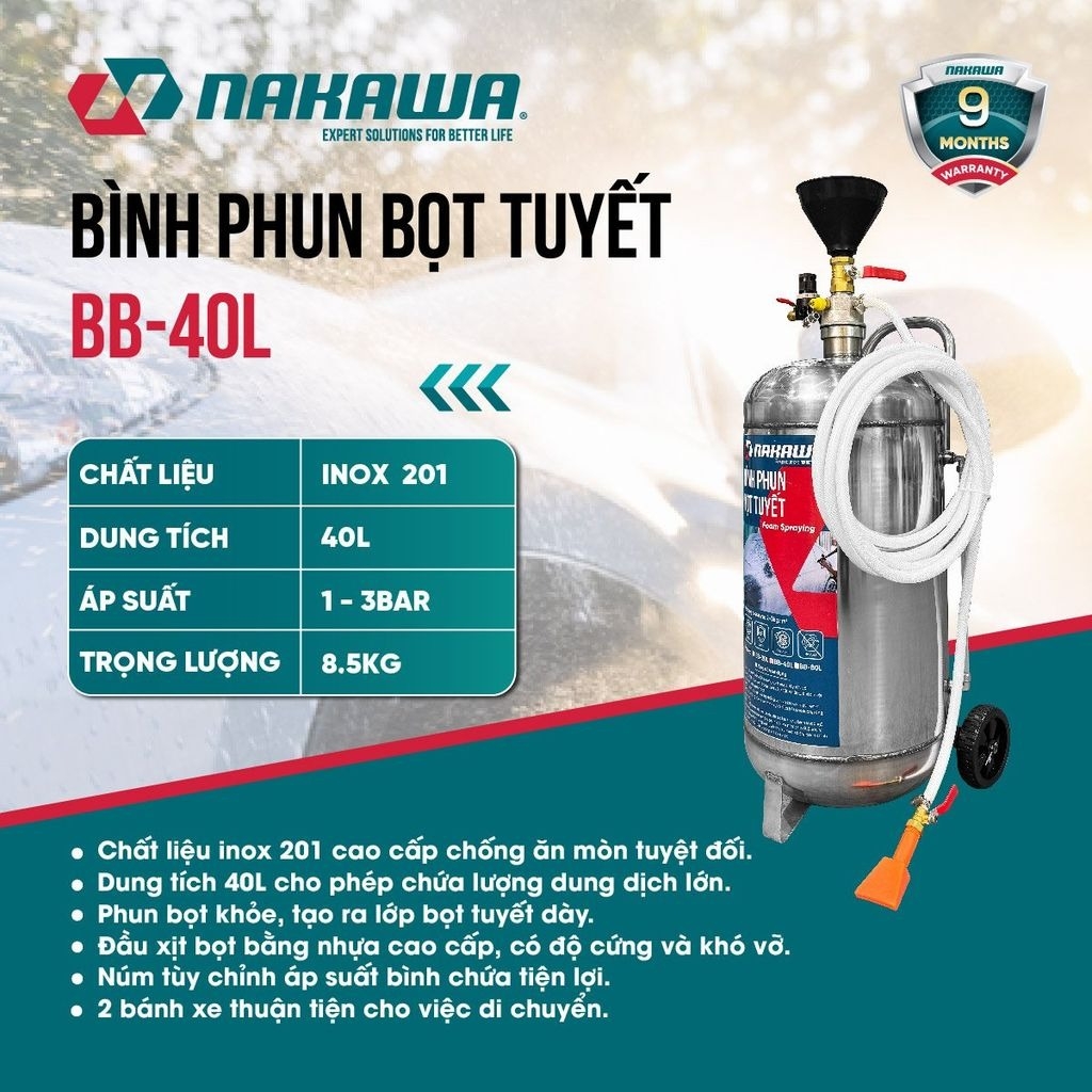 Bình phun bọt tuyết NAKAWA BB-40L được làm từ chất liệu inox 201 chống ăn mòn, tăng độ bền. Bình có dung tích 40L cho phép chứa lượng dung dịch lớn, đảm bảo được công việc xịt rửa diễn ra với tiến độ nhanh, đáp ứng nhu cầu xịt rửa liên tục và nhiều.
