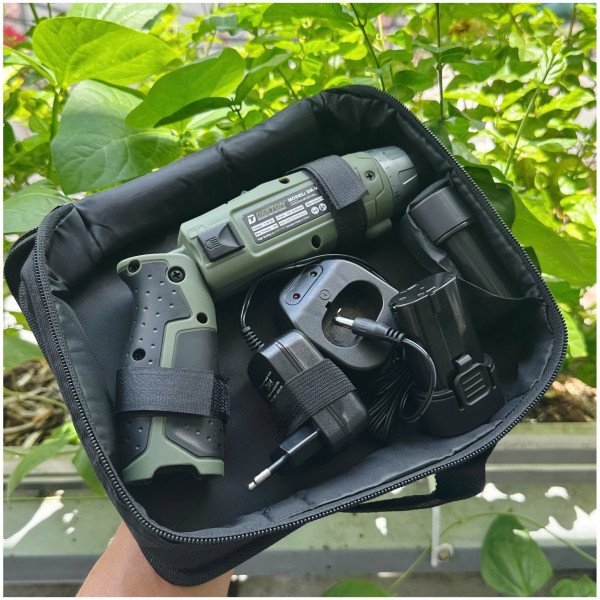 Bộ sản phẩm được đựng trong túi chống va đập, đi kèm là 1 thân máy, 2 viên pin dung lượng 2.0Ah, 1 bộ sạc