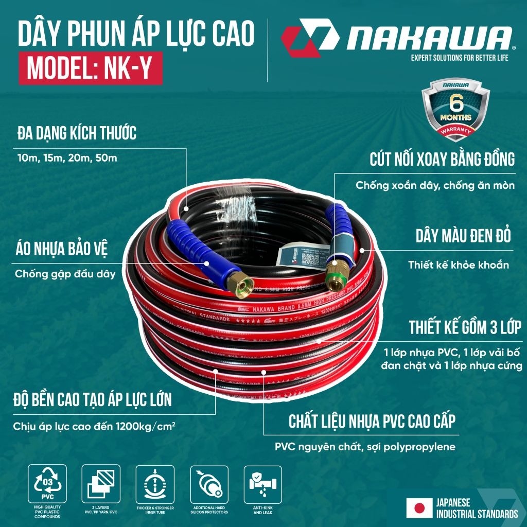 Dây phun áp lực cao Nakawa NK-Y có các kích thước: 10m, 15m, 20m và 50m để khách hàng thoải mái lựa chọn tuỳ vào nhu cầu sử dụng.