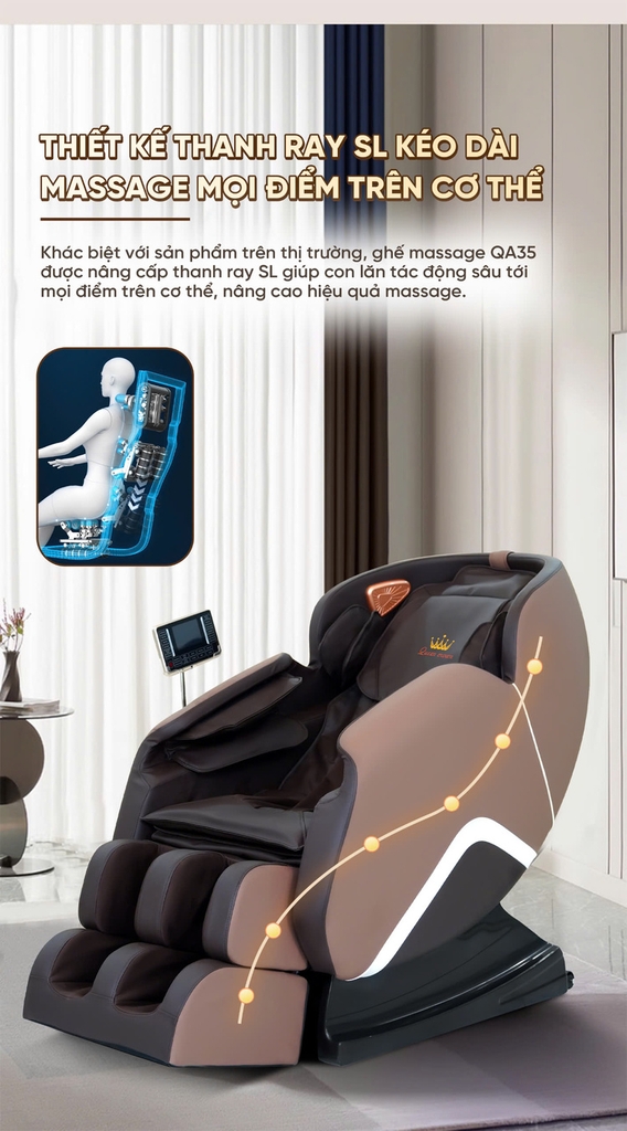 Một cải tiến đáng đồng tiền bát gạo của ghế massage Queen Crown QA35 chính là phần thanh ray hình SL. Thanh ray này được thiết kế uốn lượn, ôm sát cơ thể điều này giúp con lăn massage có thể tác động tới mọi điểm trên cơ thể ngay cả phần khó tiếp xúc như hõm lưng. Đây là cải tiến vượt trội bởi trong cùng tầm giá, công nghệ với QA35 bởi các sản phẩm khác trên thị trường chỉ sử dụng thanh ray hình L khó tác động được tới vị trí sâu trên cơ thể.