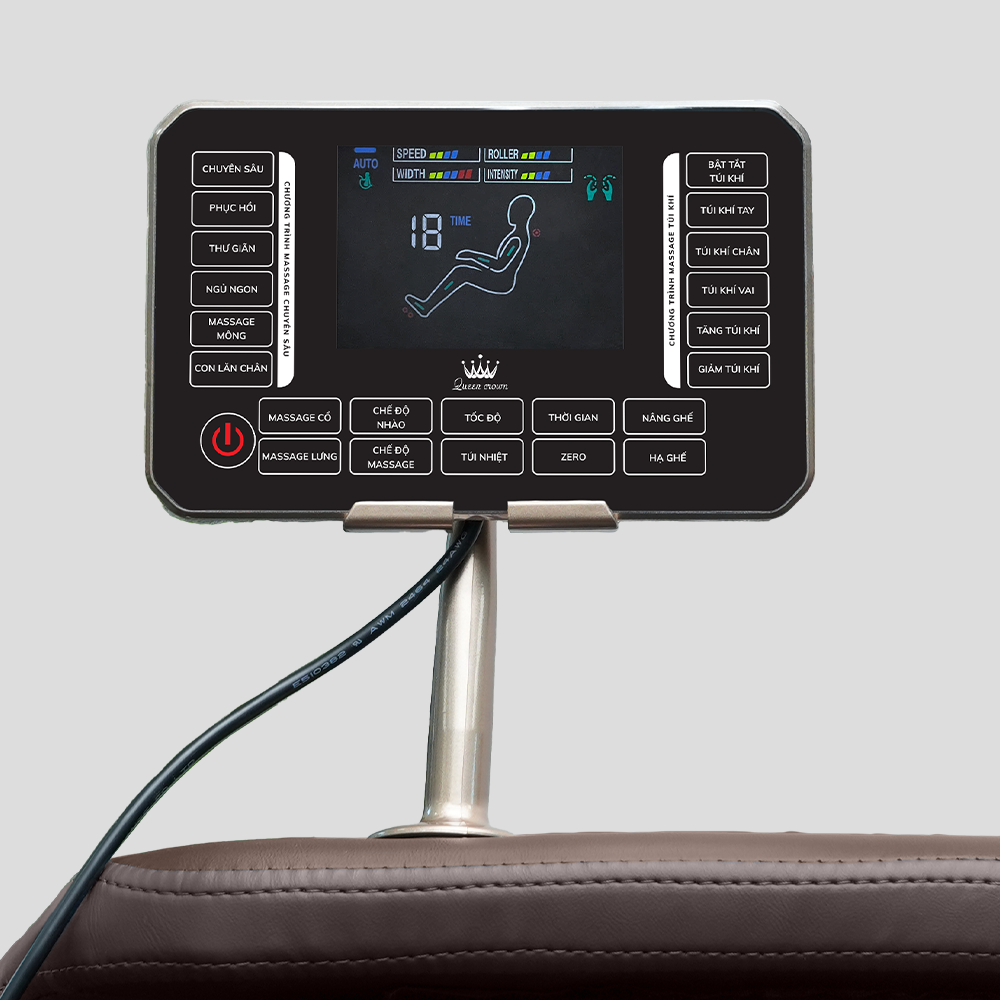 QA35 mang đến giao diện sử dụng tiện ích với bảng điều khiển cảm ứng tiếng Việt hiện đại. Chỉ với một lần chạm nhẹ bạn đã có thể tùy chỉnh điều khiển ghế theo mong muốn. Bên cạnh đó ghế massage đa năng Queen Crown QA35 còn được trang bị loa Hifi kết nối bluetooth nghe nhạc. Điều này giúp bạn có thể chìm đắm trong không gian thư giãn cùng âm nhạc tận hưởng cùng các bài tập massage chuyên sâu.