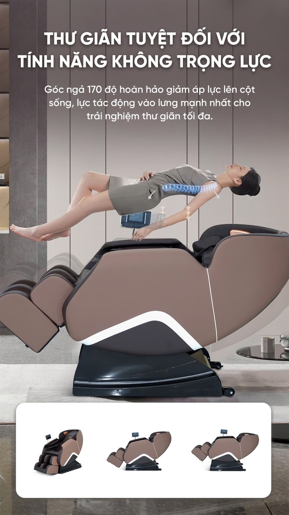 - Massage không trọng lực: Bạn sẽ được trải nghiệm thư giãn bồng bềnh như ngoài không gian vũ trụ với tính năng này. Ghế sẽ ngả ra sau một góc 170 độ giúp chân ngang bằng với tim kích thích máu lưu thông, giảm áp lực lên cột sống. Bên cạnh đó khi trải nghiệm tính năng không trọng lực thân - tâm - trí như hòa làm một cho trải nghiệm thư giãn bất tận.