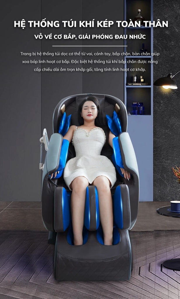 Ghế massage Queen Crown QE66 được trang bị hệ thống túi khí tại khắp các điểm nhức mỏi cơ thể từ đầu, vaI, cánh tay, bắp chân, bàn chân. Nhờ vậy toàn bộ cơ thể được chăm sóc trọn vẹn giúp bạn tận hưởng thư giãn tầng sâu.