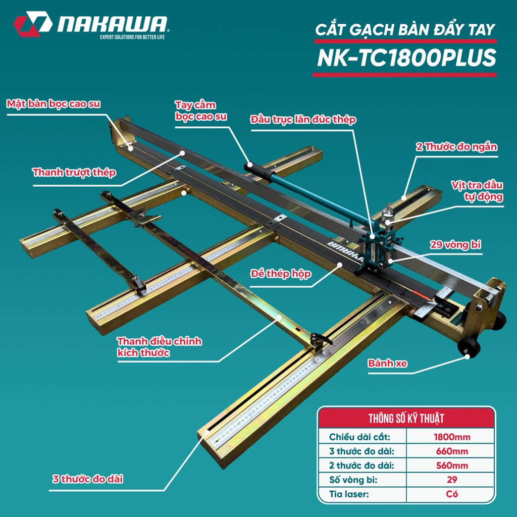 Máy cắt gạch bàn đẩy tay Nakawa NK-TC1800PLUS là dòng cắt gạch không dùng điện, không dùng nước, không bụi và không gây ồn. Máy được sử dụng phổ biến trong ngành xây dựng, chuyên dụng để cắt loại gạch men, gạch hoa có kích thước lên tới 1800mm x 1800mm. Với thiết kế tối ưu cùng nhiều tính năng vượt trội, máy mang lại hiệu suất làm việc cao, giúp tiết kiệm thời gian và công sức đáng kể.