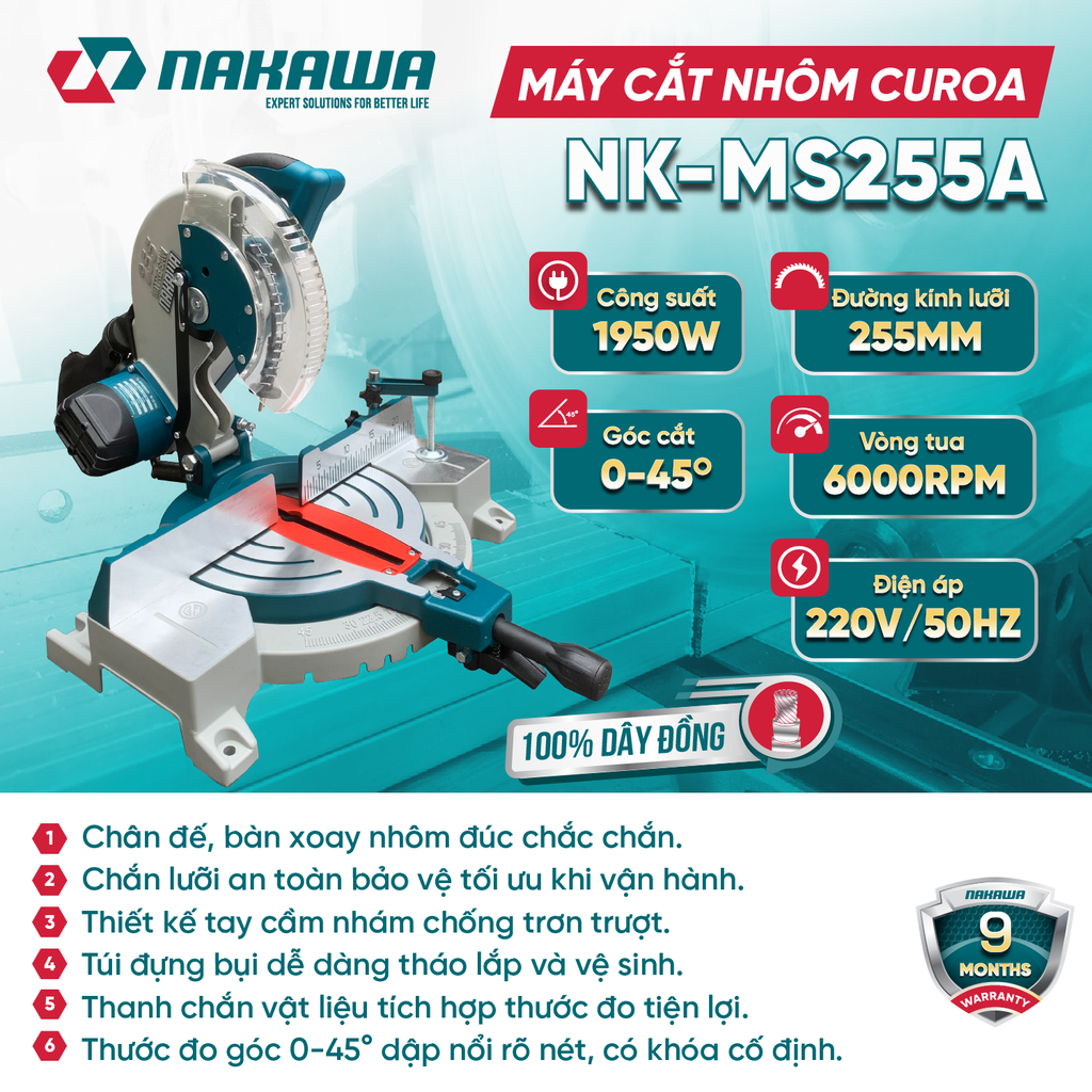 Máy cắt nhôm curoa NAKAWA NK-MS255A thiết kế chân đế và bàn xoay nhôm đúc dày dặn, có khả năng chịu lực tốt và chống rung hiệu quả khi vận hành. Tay cầm nhám chống trượt được bố trí thuận tay người dùng, giúp thao tác cắt linh hoạt và an toàn hơn. Máy được trang bị chắn lưỡi an toàn cho phép quan sát rõ ràng đường cắt trong khi vẫn bảo vệ người dùng an toàn khỏi mạt kim loại bắn ra trong quá trình vận hành. Túi đựng bụi đi kèm có thể tháo lắp nhanh chóng, giúp thu gom bụi hiệu quả, giữ cho không gian làm việc luôn sạch sẽ. Ngoài ra, máy còn được tích hợp hệ thống khe tản nhiệt, giúp làm mát động cơ nhanh chóng, đảm bảo máy vận hành ổn định ngay cả khi làm việc liên tục.