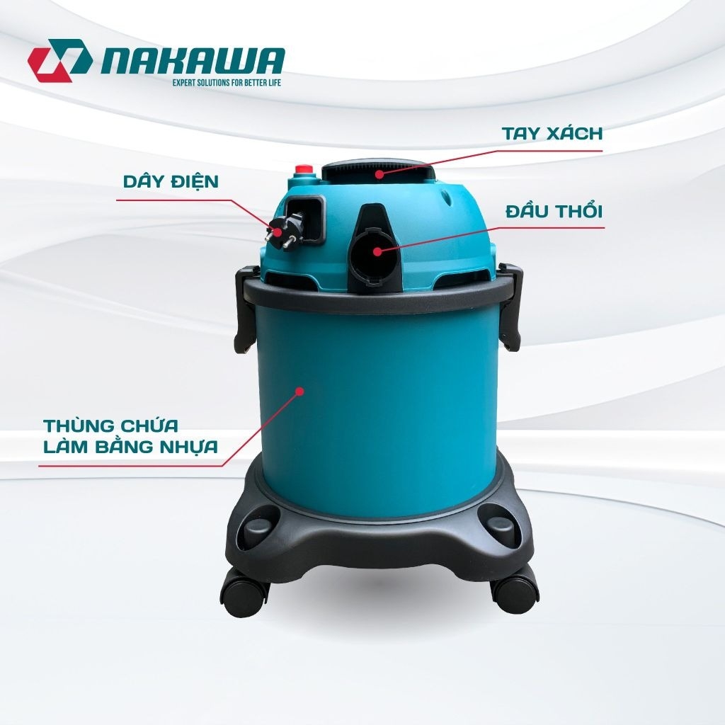 Máy hút bụi công nghiệp NAKAWA NK-HB20PLUS có công suất lớn 1600W, lưu lượng 50L/s, cùng với dung tích thùng chứa bụi 20L giúp dọn sạch bụi bẩn hay vết nước một cách nhanh chóng.