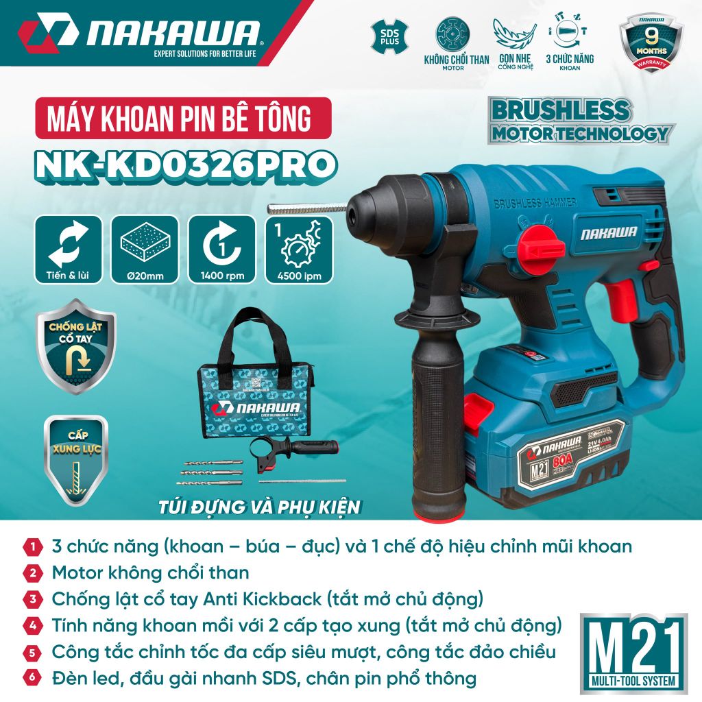 Điểm nổi bật của máy khoan pin bê tông NAKAWA NK-KD0326PRO là động cơ không chổi than (Brushless Motor), công nghệ hiện đại giúp giảm ma sát, tăng tuổi thọ động cơ, vận hành êm ái và tiết kiệm năng lượng vượt trội. Tính năng chống lật cổ tay Anti Kickback cho phép bật/tắt chủ động, giúp giảm thiểu phản lực đột ngột khi khoan búa hoặc đục, bảo vệ cổ tay người dùng và nâng cao độ an toàn trong quá trình vận hành. Ngoài ra, máy được tích hợp tính năng khoan mồi với 2 cấp tạo xung, có thể chủ động bật/tắt, giúp mũi khoan hạn chế trượt và nâng cao độ chính xác khi khoan trên vật liệu cứng.
