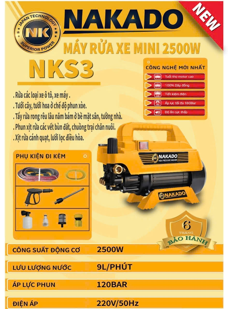 Máy Rửa Xe Nakado NKS3 được sản xuất trên công nghệ mới nhất của Nhật Bản tích hợp với những tính năng ưu việt như tuổi thọ motor cao, 100% dây đồng, tiết kiệm điện, áp lực tối đa 150bar, độ ồn cực thấp khi sử dụng.Phụ kiện bao gồm : lọc nước, dây hút 1.5m, dây áp lực 8m, súng, bình bọt. Với bộ phụ kiện đầy đủ bạn chỉ cần lắp đặt là có thể sử dụng luôn mà không cần phải mua thêm bất kỳ bộ phận nào khác.Đặc điểm nổi bật :Cút nối đầu ra và vào được làm bằng kim loại.Van một chiều cỡ lớn tạo lưu lượng nước lớn.Dây phun có bố thép làm tăng khả năng chịu áp lực cao.Xịt rửa khoẻ, áp lực cao, mô tơ 100% dây đồng, tự ngắt khi nhả cò súng.Máy chạy êm, ít gây tiếng ồn.Linh kiện chính hãng, độ bền cao.Phụ tùng kèm theo đầy đủ, súng có thanh nối dài.