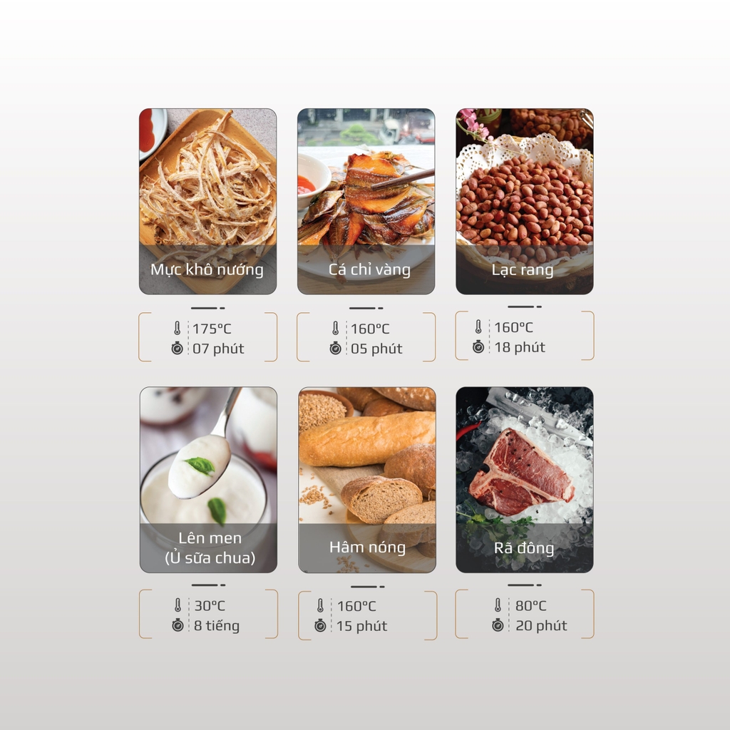 Nồi được cài sẵn 70 chế độ, chức năng dành cho những thực phẩm phổ biến như gà, bò, sườn, tôm, cá, rau củ, bánh,….Những chế độ này đã cài sẵn thời gian, nhiệt độ phù hợp với từng thực phẩm, người dùng chỉ cần chọn chế độ cho nồi hoạt động là món ngon đã sẵn sàng.