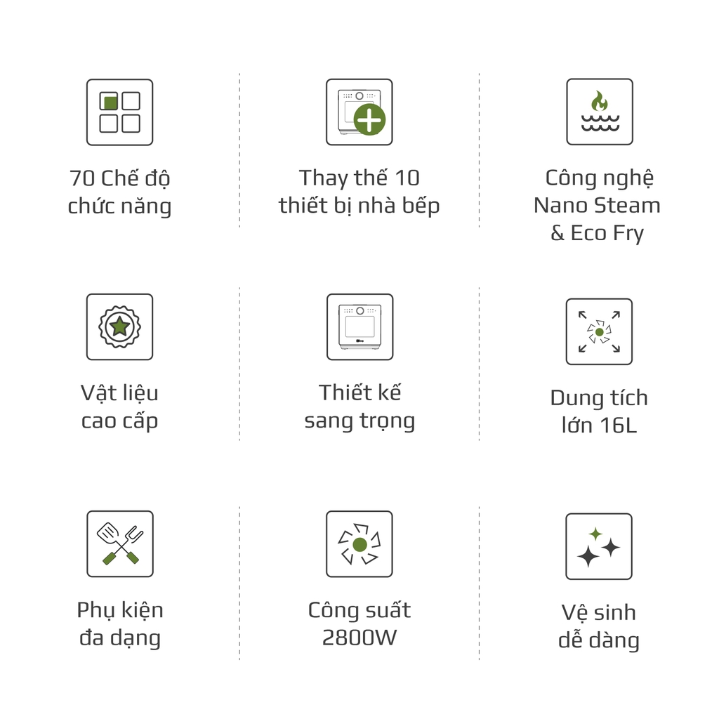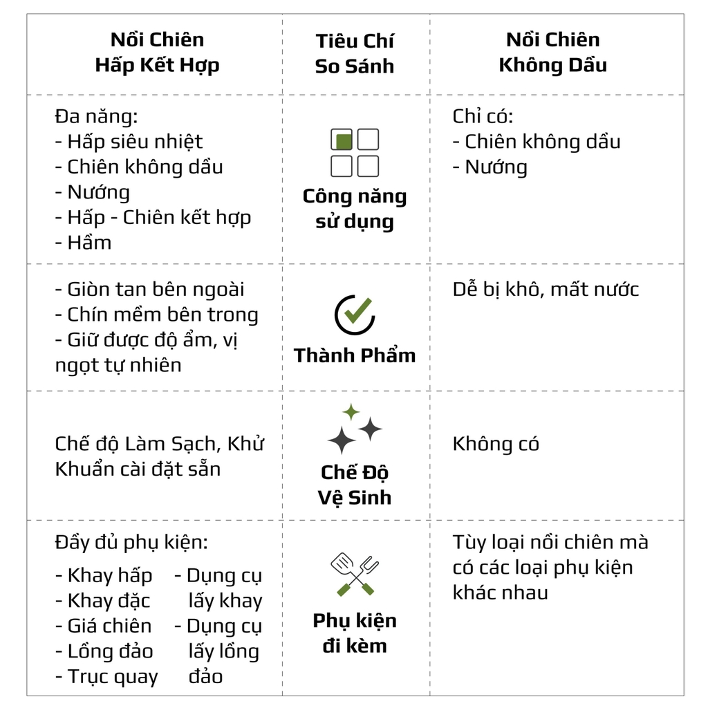 Chiên không dầu chiên đồ ăn vàng giòn mà không cần dùng đến dầu mỡ, giảm đến 95% lượng dầu mỡ dư thừa trong bữa ăn hàng ngày. Trong khi đó, hấp đồ ăn bằng hơi nước siêu nhiệt giúp giảm thời gian hấp, đồng thời bảo toàn tối đa dinh dưỡng có trong thực phẩm.