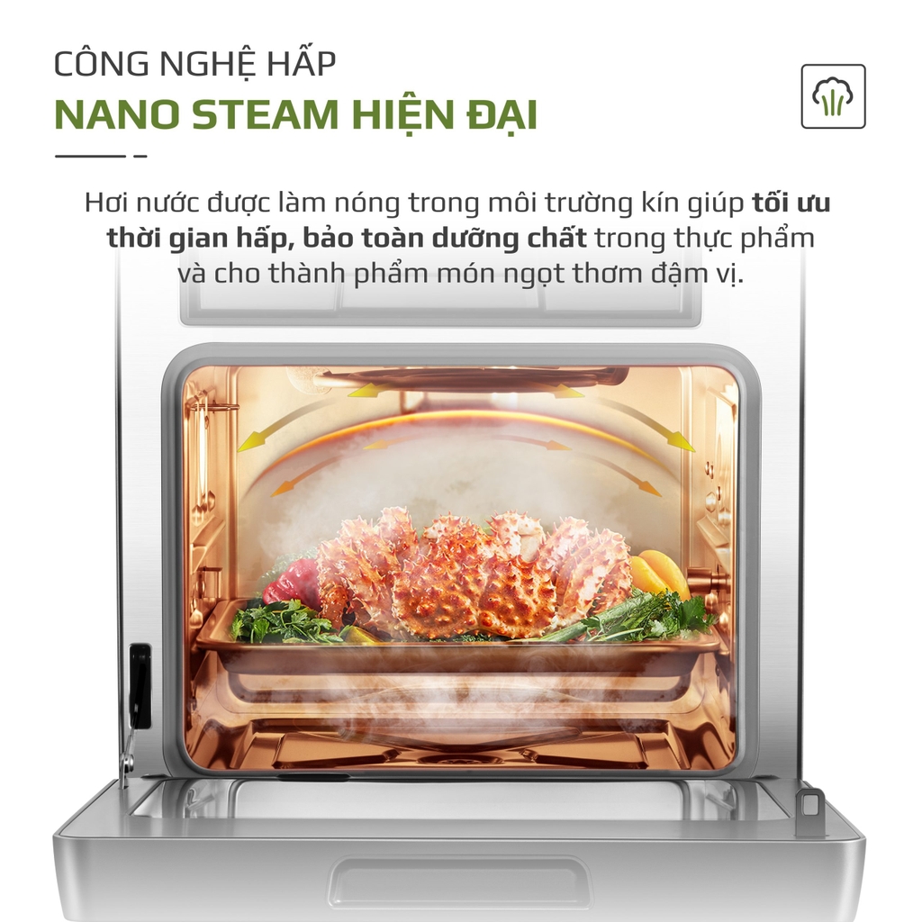Sản phẩm ứng dụng công nghệ Nano Steam làm nóng hơi nước trong môi trường kín kết hợp hệ thống phun hơi nước siêu nhiệt giúp bảo toàn dưỡng chất trong thực phẩm, tối ưu thời gian nấu. Cho thành phẩm món hấp ngọt thơm, đậm vị.