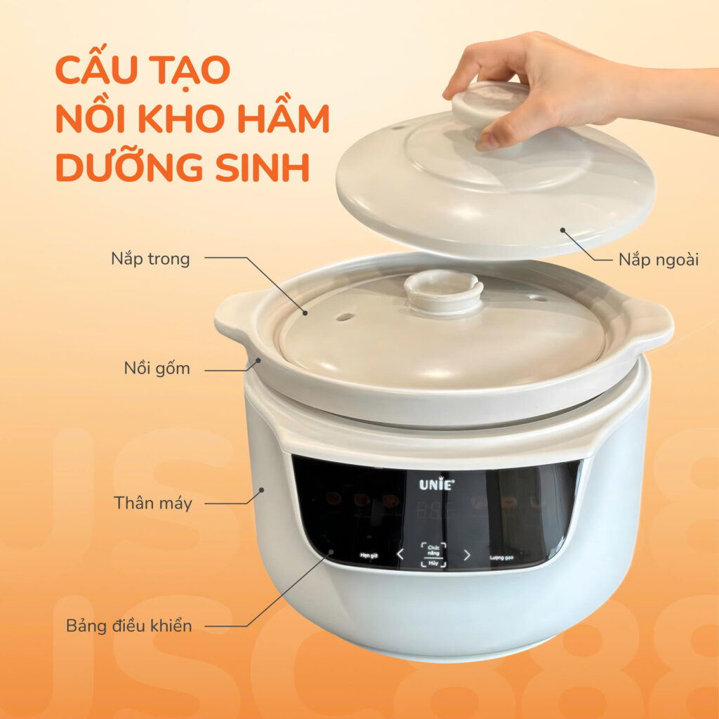 Nồi kho hầm dưỡng sinh Unie USC888 được cấu tạo gồm nắp ngoài, nắp trong, lòng nồi gốm, thân máy và bảng điều khiển điện tử. Các bộ phận được thiết kế đồng bộ, giúp giữ nhiệt ổn định, vận hành dễ dàng và đảm bảo an toàn, đáp ứng hiệu quả nhu cầu kho hầm dưỡng sinh mỗi ngày.