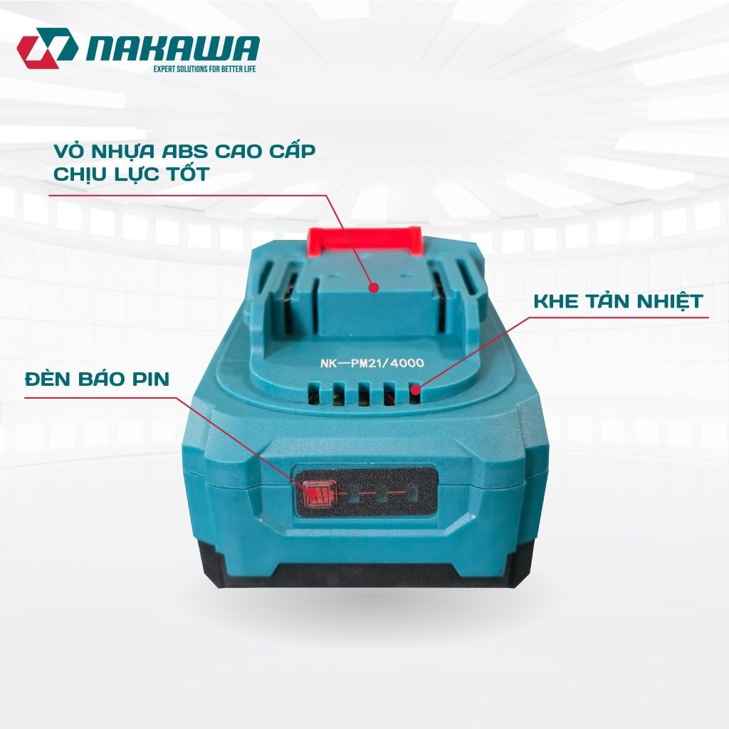 Sở hữu dung lượng 4.0Ah cùng cell pin DMEGC 21V dòng xả 15C, pin NAKAWA NK-PM21/4000 cung cấp dòng điện mạnh mẽ, đáp ứng tốt các thiết bị đòi hỏi công suất cao, đảm bảo máy vận hành ổn định và bền bỉ trong mọi điều kiện làm việc.