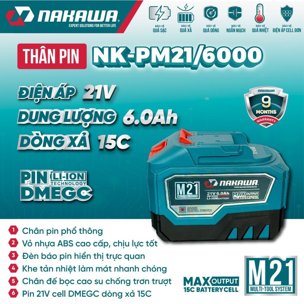 Pin 21V 6.0Ah NAKAWA NK-PM21/6000 được trang bị hệ thống bảo vệ an toàn thông minh bao gồm: