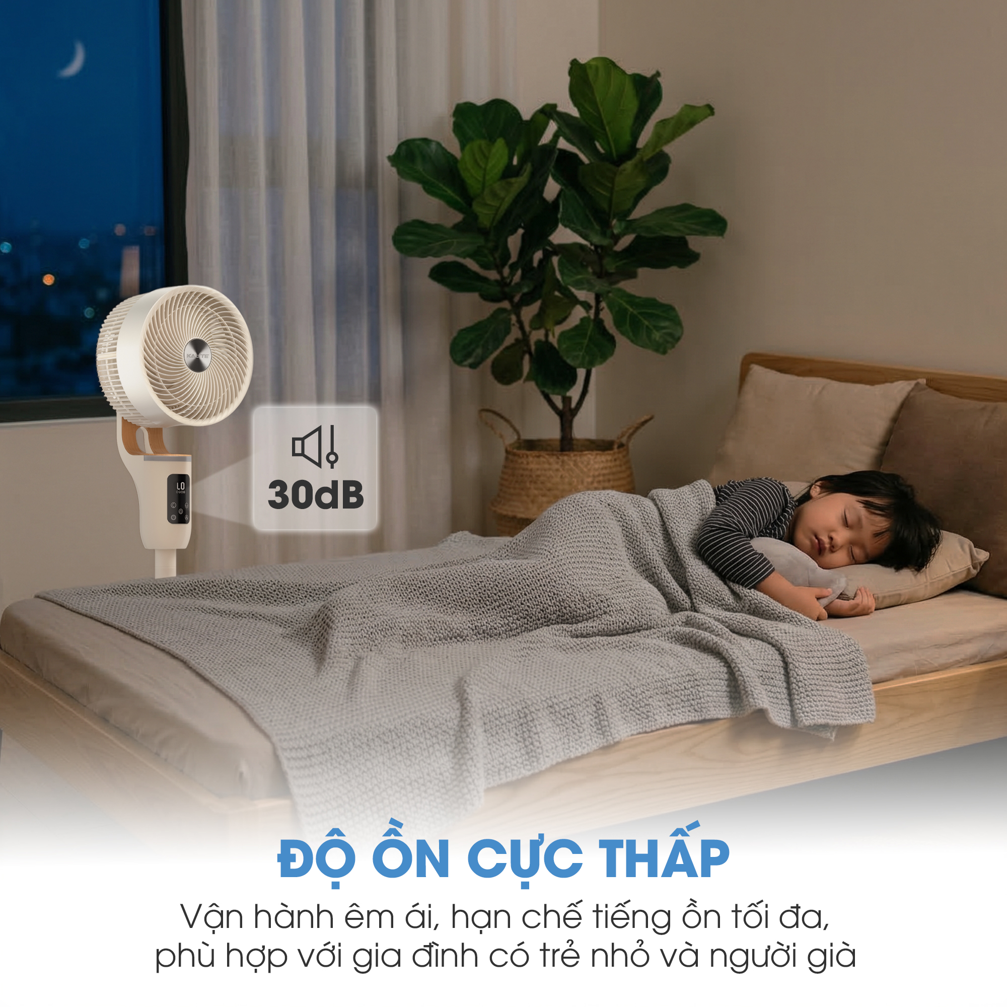 Vận hành siêu êm ái: Độ ồn cực thấp chỉ 30dB nhờ động cơ AC không chổi than, đảm bảo giấc ngủ sâu cho trẻ nhỏ và người già.