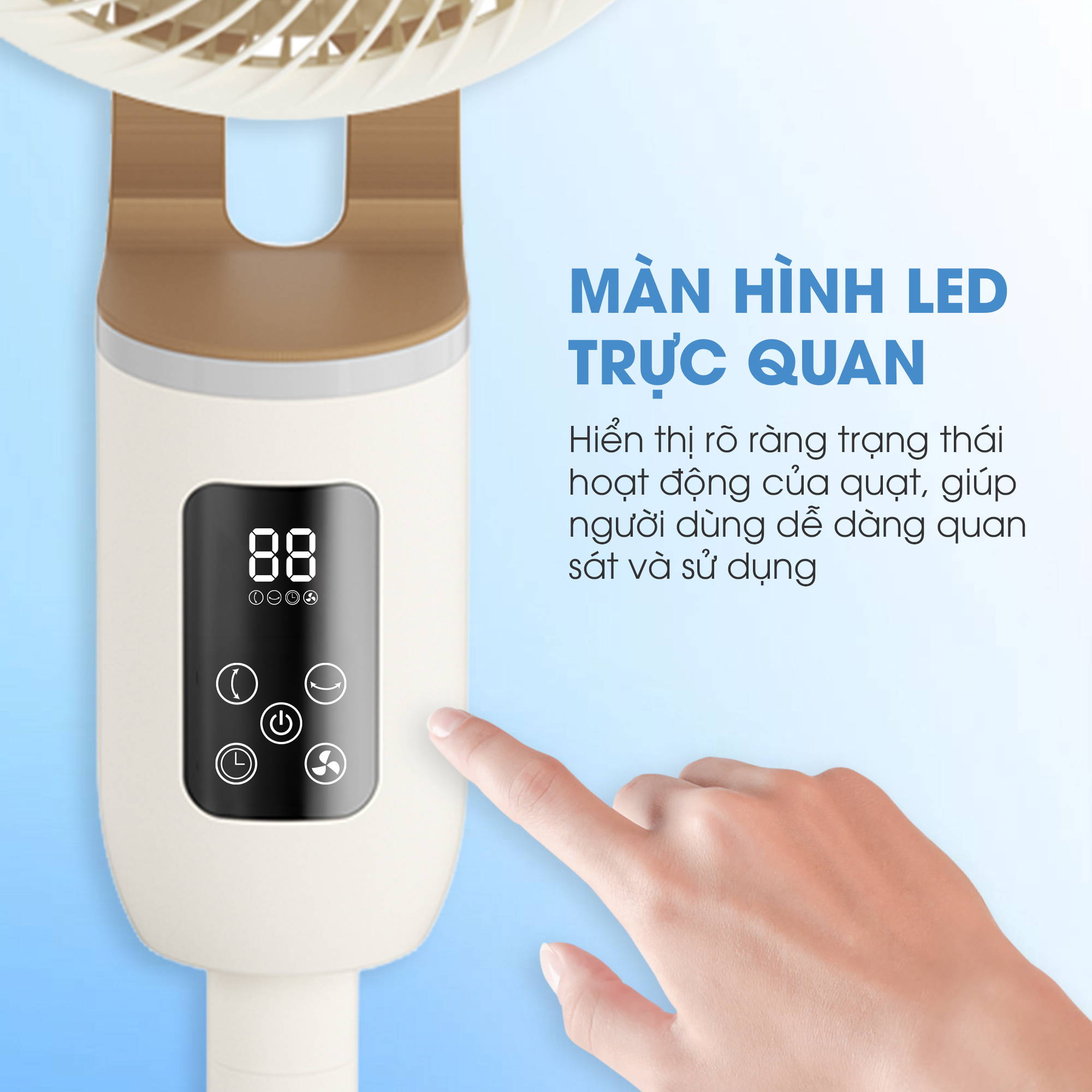 Kalite Talkfan KSA326 được trang bị màn hình LED sắc nét, hiển thị rõ ràng mức độ gió và các thông số hoạt động của quạt. Tính năng này mang lại lợi ích quan sát cực kỳ tiện lợi, giúp người dùng dễ dàng theo dõi và điều chỉnh ngay cả trong bóng tối mà không cần bật đèn. Sự kết hợp giữa bảng điều khiển cảm ứng mượt mà và hiển thị trực quan không chỉ nâng tầm vẻ đẹp công nghệ mà còn đem đến sự an tâm, thoải mái tuyệt đối cho giấc ngủ của cả gia đình.