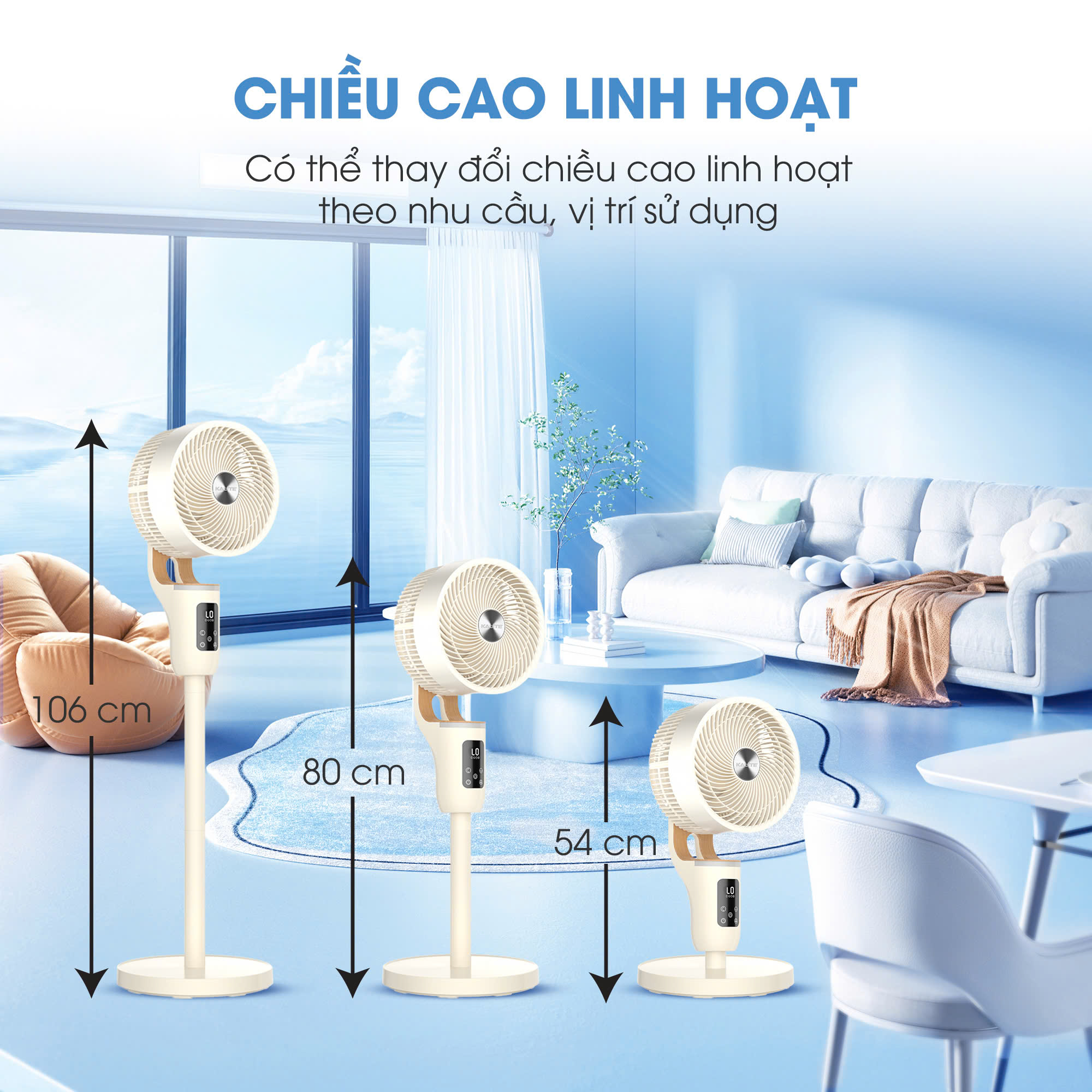 Kalite Talkfan KSA326 sở hữu thiết kế thông minh cho phép thay đổi chiều cao một cách dễ dàng và linh hoạt theo nhu cầu thực tế. Tính năng này mang lại lợi ích đa năng vượt trội: bạn có thể sử dụng quạt như một chiếc quạt đứng cho phòng khách, hay hạ thấp để đặt trên bàn, trong phòng ngủ hoặc góc làm việc. Dù ở bất kỳ không gian hay vị trí nào, quạt đều đảm bảo luồng gió tiếp cận đúng tầm, mang đến sự mát mẻ và tiện nghi tối đa cho người dùng.